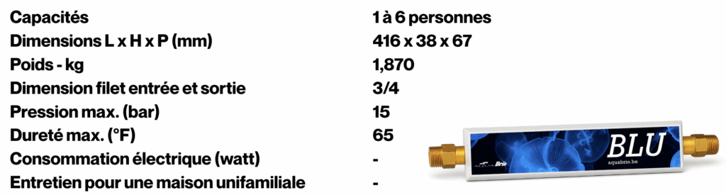L’adoucisseur BLU empêche la fixation du calcaire tout en préservant la qualité naturelle de l’eau. Il fonctionne sans électricité, sans sel, sans produits chimiques ni régénérant, ce qui en fait une solution écologique, économique et sans entretien.