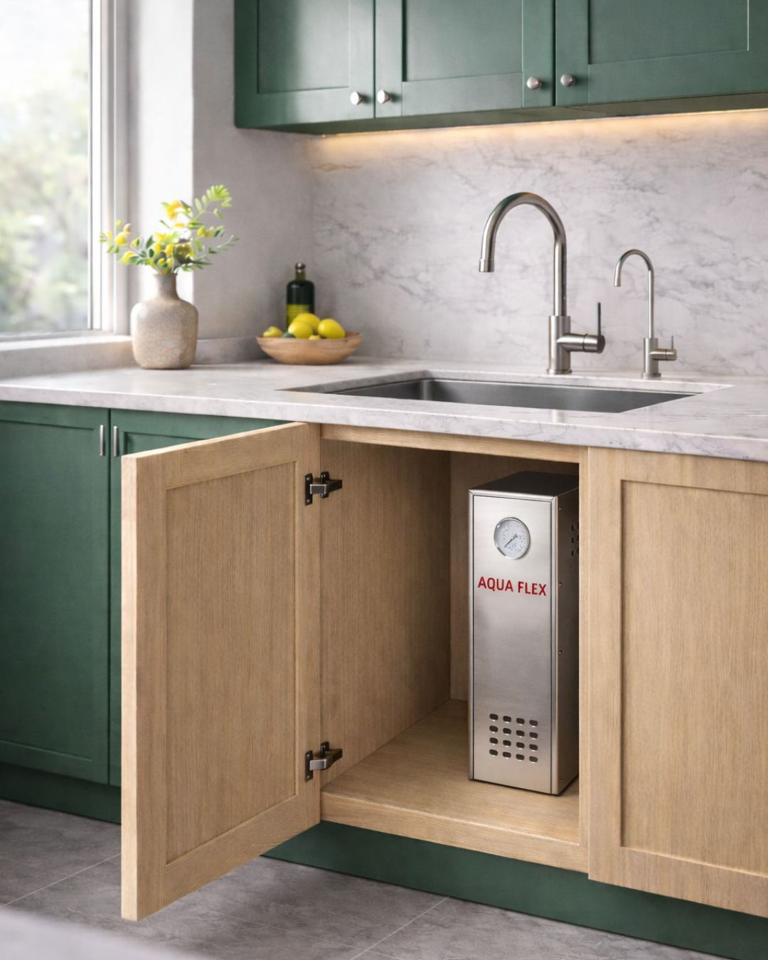 Son design compact et sans réservoir permet une installation aisée sous l’évier, offrant un accès direct à une eau pure et saine. De plus, l’Aqua Flex se distingue par sa performance élevée, avec une capacité de production minimale de 120 litres d’eau par heure, soit environ 30 secondes pour un litre d’eau, garantissant une disponibilité continue sans risque de stagnation.