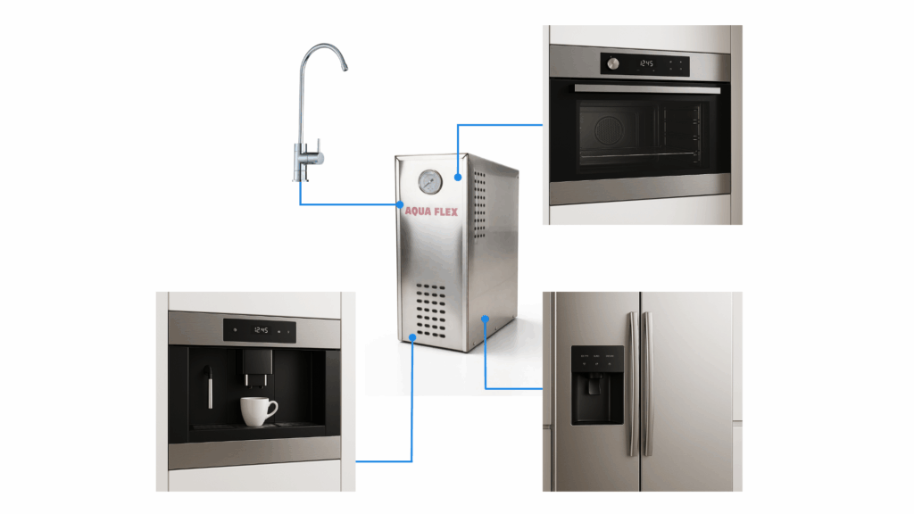 Sa pression stable et sa puissance permettent également une connexion directe à des équipements domestiques tels qu’un frigo américain, un four vapeur ou une machine à café, assurant une eau pure partout où vous en avez besoin.